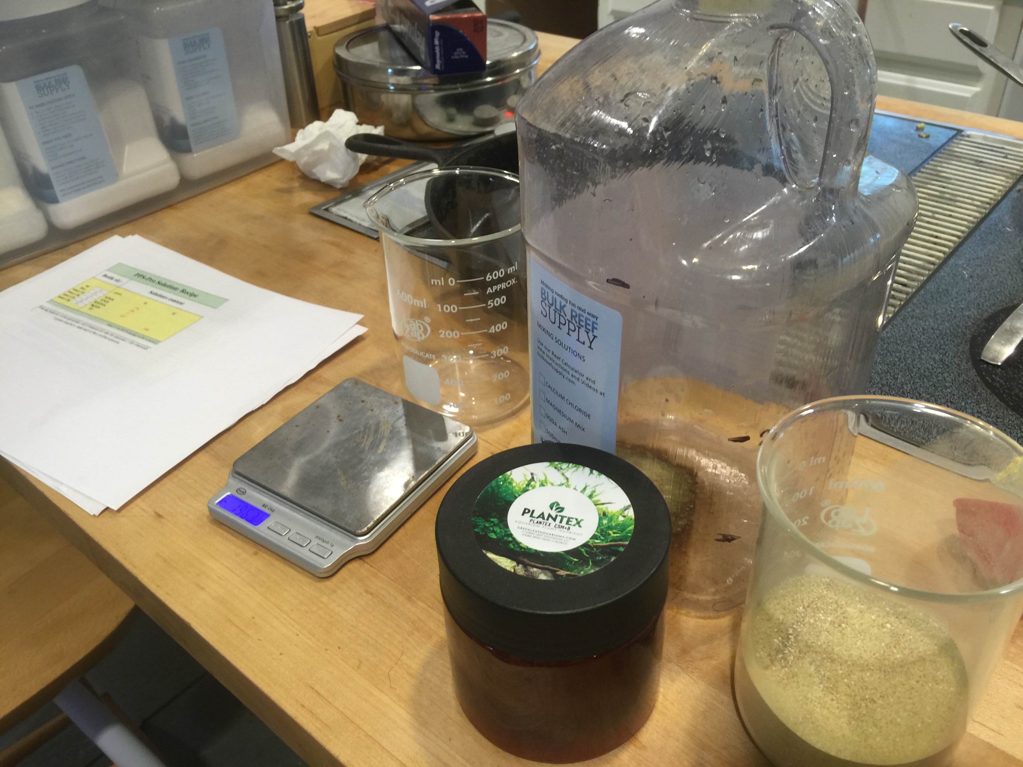 We periodically mix batches of calcium, alkalinity, and magnesium for the saltwater tanks and Perpetual Preservation System macro and micro nutrients for the freshwater planted tanks. These are dosed at 1.1ml/min with peristaltic pumps.