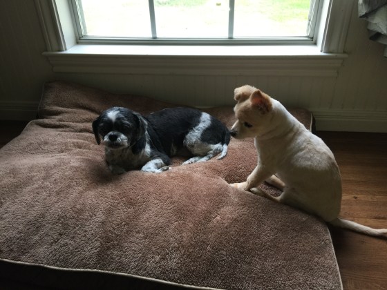 Two little dogs in a window