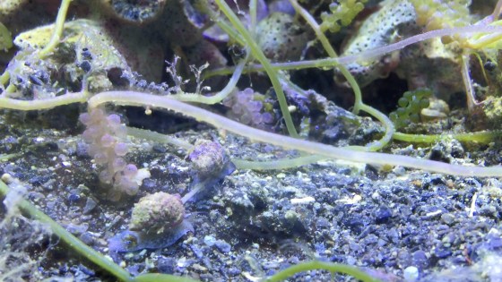 Nassarius snails emerge from the substrate with siphons waving at feeding time.